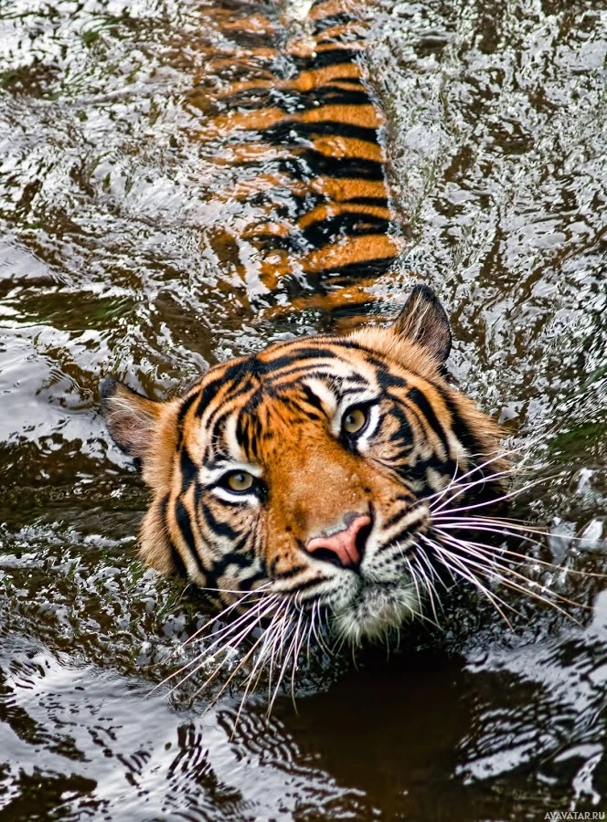 На снимке изображен тигр, плавающий в воде. Тигр выглядит сосредоточенным и смотрит в сторону камеры, ясно показывая глаза и рот. Вода вокруг тигра спокойна, предполагая, что он может медленно двигаться или стоять в воде.