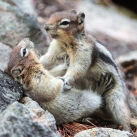 На картинке изображены два бурундука в естественной наружной обстановке. Один из бурундуков, кажется, кусает или кусает другого, который лежит на спине с открытым животом. Они окружены скалами и растительностью, что говорит о том, что они находятся в лесистой местности.