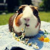 The image shows a Guinea pig sitting on a blue cloth with flowers around it. The Guinea pig is facing the camera and appears to be relaxed, surrounded by small yellow flowers and greenery that suggests it might be enjoying a sunny day outdoors. There are no people visible in the picture.