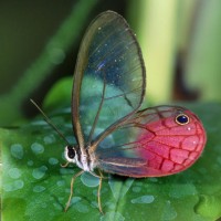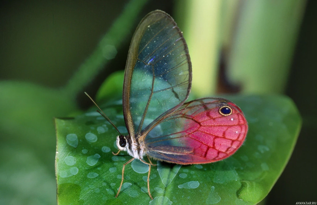 a green leaf that appears to be wet. The butterfly has