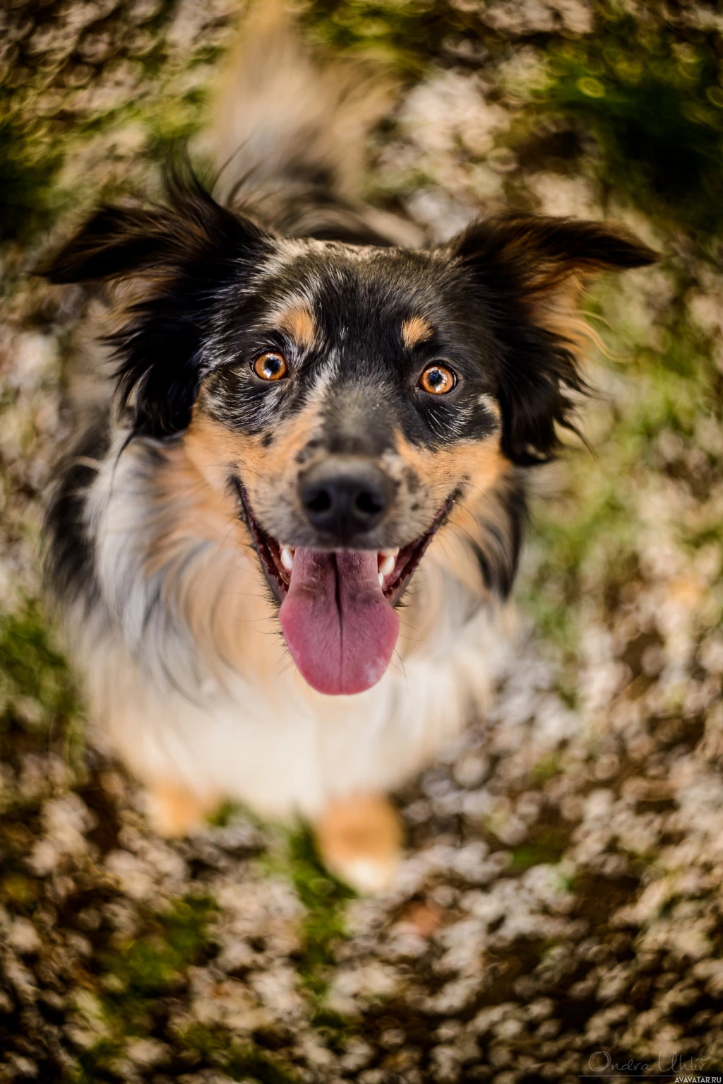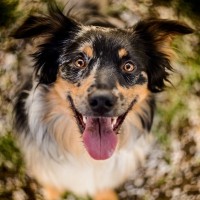 various colors such as black, brown, and white, suggesting it may be a breed with such coloring like the Australian Shepherd or a similar mix. The background is blurred but appears to be outdoors, possibly on