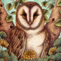 a tree branch adorned with green leaves and some yellow flowers, which suggest the presence of a forest or woodland environment. The artwork captures the essence of the owl's appearance, characterized by its large