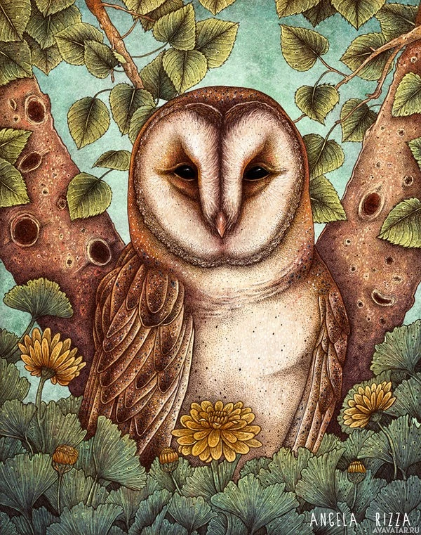 The image depicts a detailed illustration of an owl in its