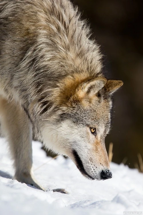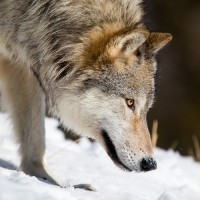snowy terrain. It appears to be looking down or sniffing at something on the ground, possibly hunting for prey or exploring its surroundings. The wolf's fur is thick and matted, suggesting it may be living in