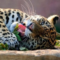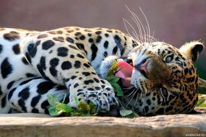 На снимке изображен леопард, который является животным. Кажется, что он лежит и взаимодействует с окружающей средой, кусая или облизывая что-то с земли. У леопарда есть отличительные пятна на шерсти.