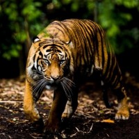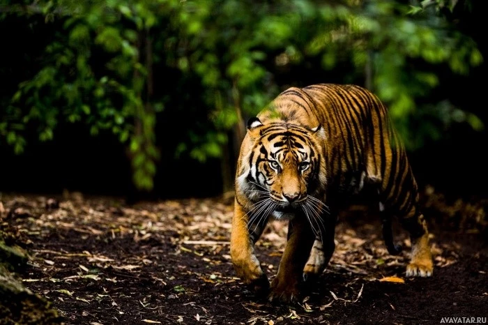 На картинке изображен тигр, идущий в лесу или джунглях. Тигр изображен в его естественной среде обитания, которая включает в себя густую растительность и, возможно, другую дикую природу, предполагая, что он может искать пищу или перемещаться по своей территории.