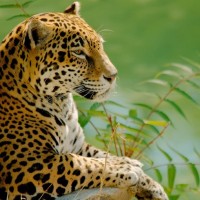 something in the distance, possibly observing its surroundings or watching for prey. The background includes greenery and water, suggesting that this scene is taking place near