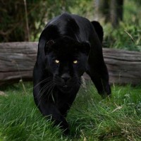 a black panther, which is an adult male jaguar. It's walking on a grassy area with some fallen logs and brush in the background, indicating it might be in
