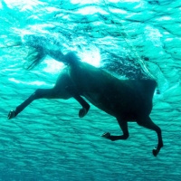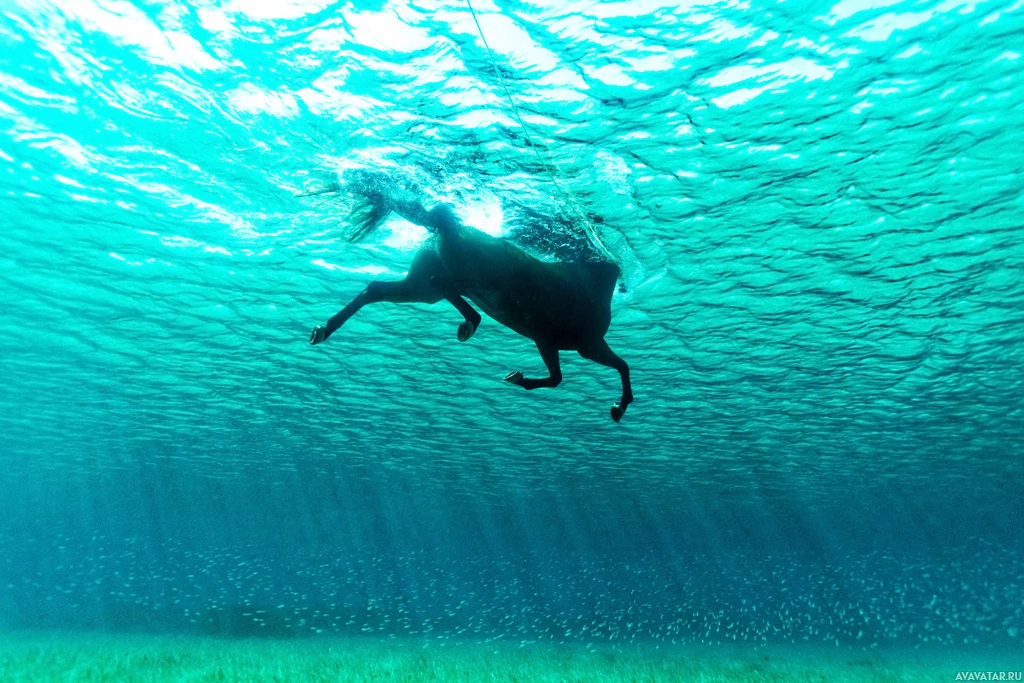the ocean floor below and the plants that grow near the surface. The horse is not wearing any saddle or rider, suggesting it might be free-swimming rather than being led by a person for recreation.