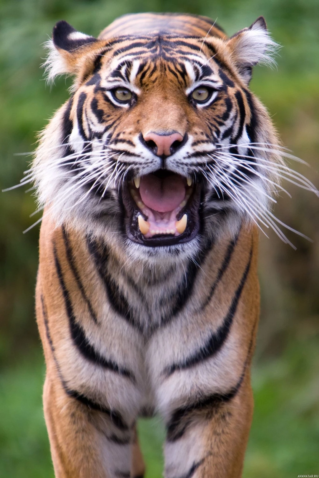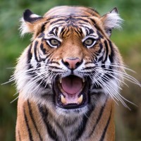 fur pattern with dark stripes on the body, and lighter areas around the face and chest. The tiger appears to be either growling or roaring in a state that suggests agitation or defiance.