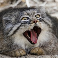 На картинке изображен манул, который является разновидностью дикой кошки. Он находится на открытой местности с песком или почвой под ним. У манула рот широко раскрыт, как будто он кричит или зовет на помощь.