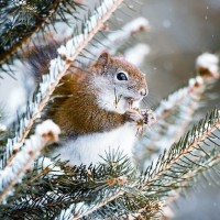 The image shows a small squirrel perched on the branches of a pine tree. It appears to be in a snowy environment, as indicated by the presence of snowflakes and the white substance covering the ground. The squirrel seems alert and is looking in one direction, possibly observing its surroundings or scanning for food or potential threats.
