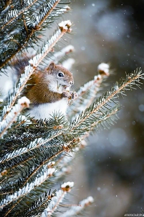 На картинке изображена маленькая белка, сидящая на ветвях сосны. По-видимому, он находится в снежной среде, о чем свидетельствует наличие снежинок и белого вещества, покрывающего землю. Белка кажется настороженной и смотрит в одном направлении, возможно, наблюдая за окружающей средой или сканируя продукты питания или потенциальные угрозы.