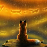 celestial bodies, there is a repetitive motif of silhouettes that appear to be wolves or similar creatures. This creates an interesting contrast between the serene,