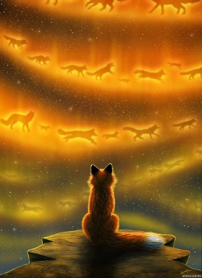 The image depicts a fox sitting on a rock, looking up towards the sky. The background features an aurora-filled