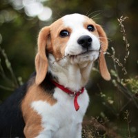 The picture features a Beagle dog, which is characterized by its distinctive facial markings and ears. The dog appears to be looking at the camera with a calm or curious expression. The setting suggests an outdoor environment with some vegetation in the background.