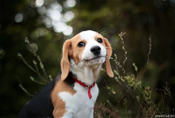 На картине изображена собака-бигль, которая характеризуется своей отличительной маркировкой лица и ушами. Собака смотрит на камеру со спокойным или любопытным выражением лица. Настройка предполагает наружную среду с некоторой растительностью на заднем плане.