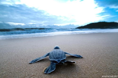 На снимке изображена морская черепаха на пляже. Кажется, что он находится на краю воды, либо идя к океану, либо выходя из него после откладывания яиц на песке.