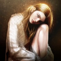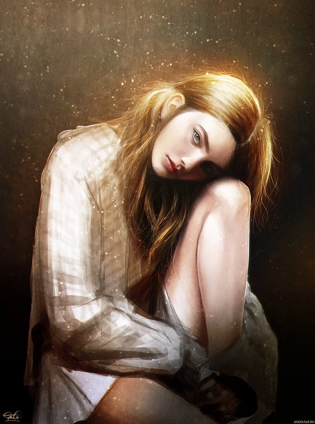white garment. Her posture is somewhat slouched or relaxed, and her head is resting on one hand as she gazes downward towards the ground. The background is not very detailed but seems to have a soft, muted color palette that complements the subject's attire.
