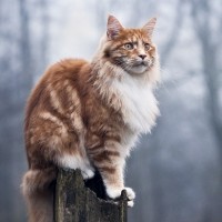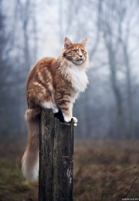 an outdoor setting, possibly during autumn or winter, given the misty atmosphere and leafless trees in the background. The cat has a long