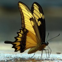 The image shows a butterfly with vibrant yellow and black wings. It is sitting on what appears to be