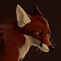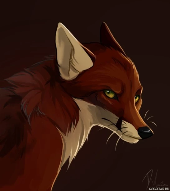 Картинка показывает иллюстрацию лисы. На ней изображены голова и верхние плечи красного существа с острыми ушами, острыми зубами и желтыми глазами. Выражение лисы серьезное или интенсивное, что добавляет ей характерного внешнего вида.