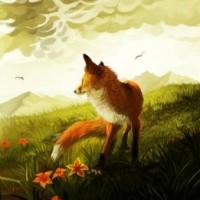 a tranquil landscape with a fox standing in the foreground, looking towards the viewer. In the background, there are rolling hills and