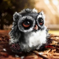 This is a picture of an animated owl sitting on what appears to be a brick surface. It has large, expressive eyes and seems to be looking at something off-camera with curiosity or concern. The image includes some fall leaves around the owl, suggesting it might be in a park or garden setting during autumn.