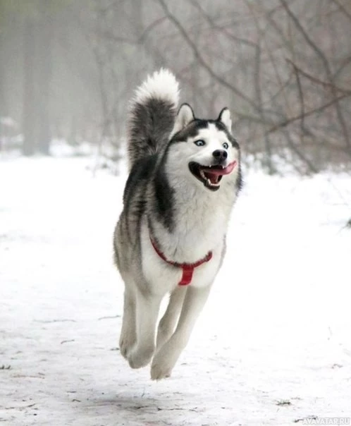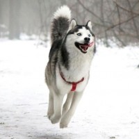 an Alaskan Malamute, which is also commonly referred to as a husky due to its origin and breed type. The dog appears to be in mid-stride while running or trotting on what looks like