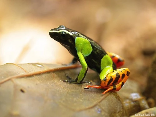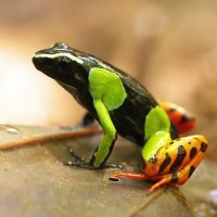 bright colors, which might indicate a species like the poison dart frog due to its vibrant red, green, and yellow markings. The frog in the background has similar coloration but appears smaller and is not fully visible. The environment looks like a jungle or