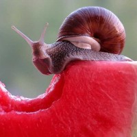 На картинке изображена улитка (животное), ползущая по поверхности арбуза. Это пример типичного поведения улиток, которые, как известно, исследуют и медленно перемещаются по различным поверхностям.