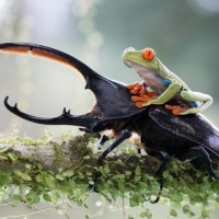 The image shows an animal, specifically a frog, riding on the back of another animal that is known to be a beetle. This interaction creates a unique and whimsical scene that combines elements from two different classes of animals—frogs and beetles.