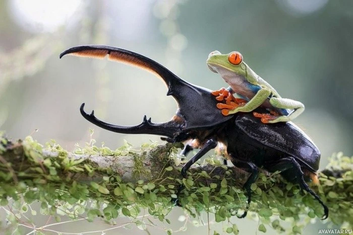 На снимке изображено животное, в частности лягушка, едущая на спине другого животного, которое, как известно, является жуком. Это взаимодействие создает уникальную и причудливую сцену, которая сочетает в себе элементы двух разных классов животных — лягушек и жуков.