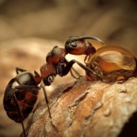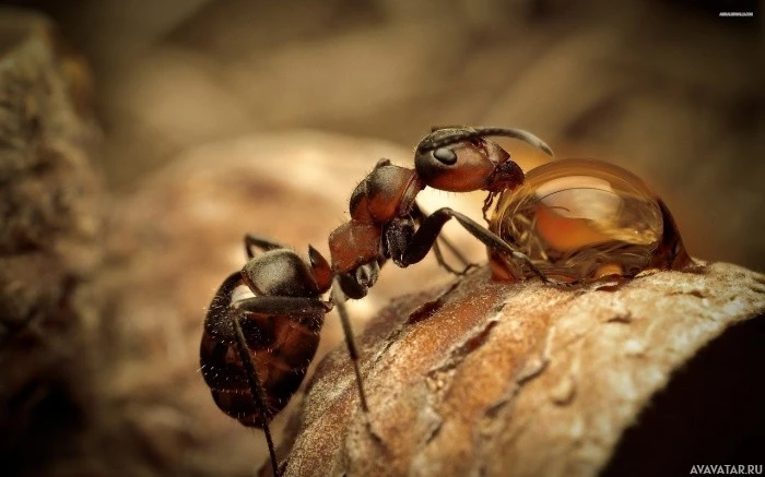 Картинка показывает двух муравьев, участвующих в битве или противостоянии. Один муравей позиционируется так, как будто он атакует или защищается от другого, который, кажется, лежит на спине в покорной позе. Эта сцена предполагает, что муравьи вовлечены в территориальный спор или форму борьбы за господство в своей колонии.