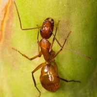 The image shows a close-up of an ant, which is an insect. Ants are known for their social behavior and the way they work together in colonies. This particular ant appears to be on a leaf or some plant material, as suggested by the background.