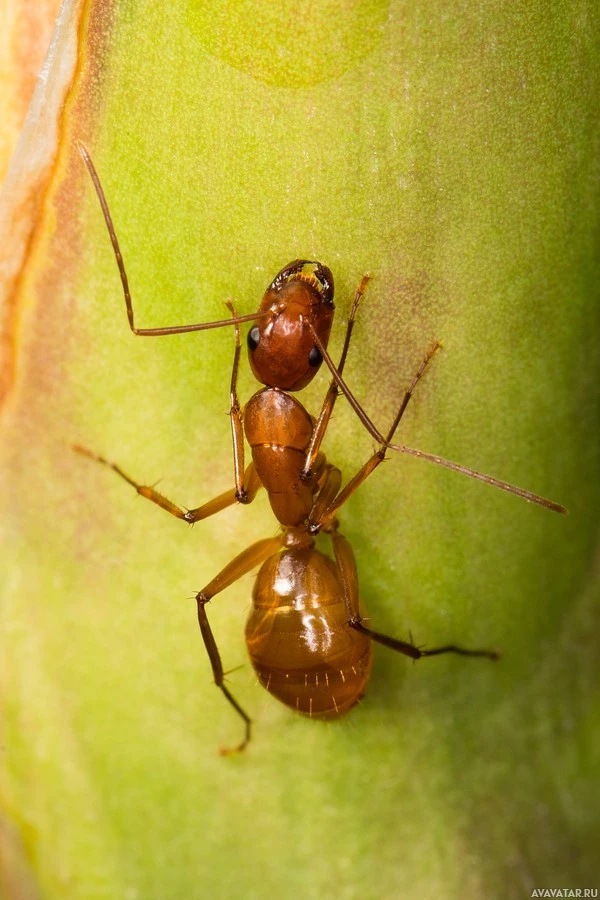 Картинка показывает крупный план муравья, который является насекомым. Муравьи известны своим социальным поведением и тем, как они работают вместе в колониях. Этот конкретный муравей, по-видимому, находится на листе или каком-то растительном материале, как показано на заднем плане.