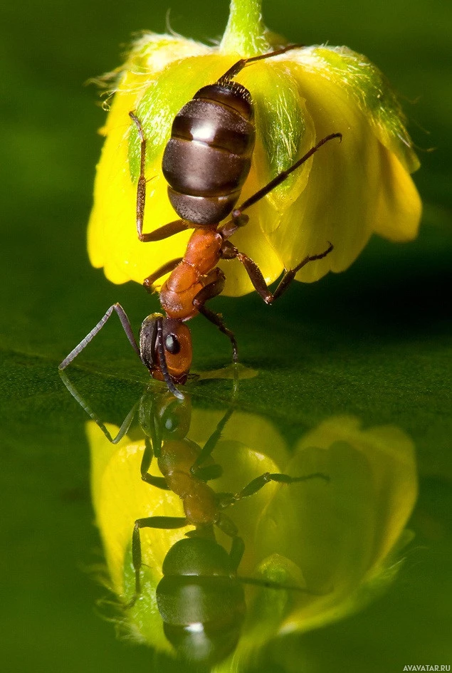 reflection of the ant, showcasing its form and details. This is likely a photograph taken in