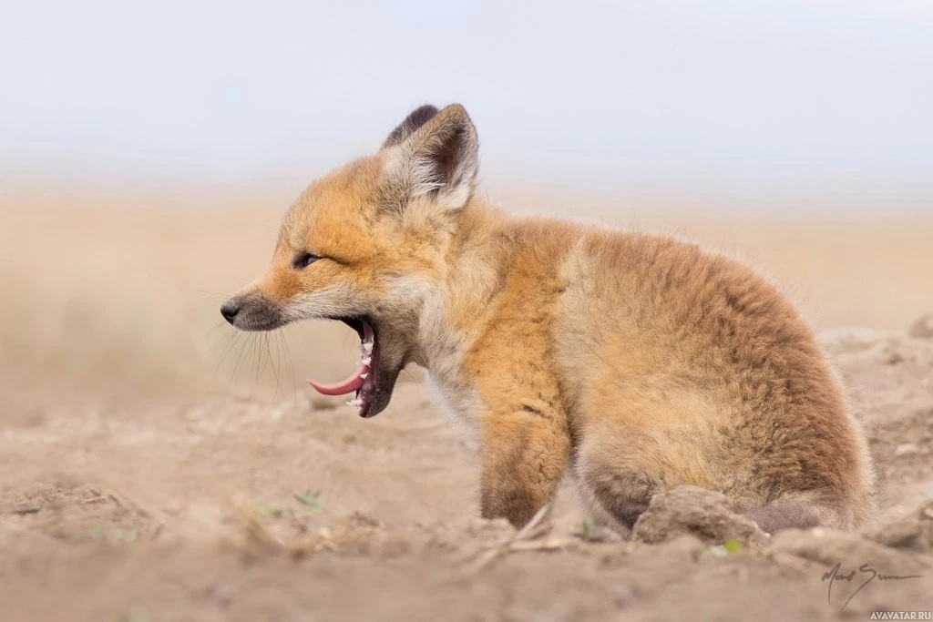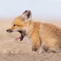dry grass or dirt. The fox has its mouth open as if it is yawning or panting. Its fur is a shade of brown and white, typical of red foxes. The background is not very distinct but seems to suggest an open area that could be part of the fox's