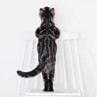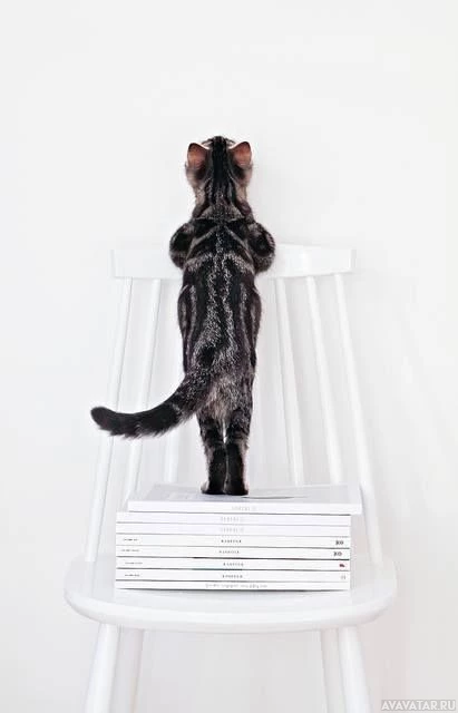 На картинке изображена маленькая кошка, стоящая на стопке книг или бумаг, помещенных на стул. Кошка смотрит вверх и кажется любопытной о чем-то в верхней части изображения.