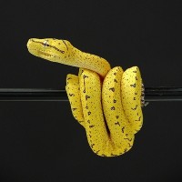 The image shows a yellow snake, which appears to be an arboreal species due to its slender body and long tail. It is positioned on a black background that contrasts with the bright color of the snake, enhancing its visibility.