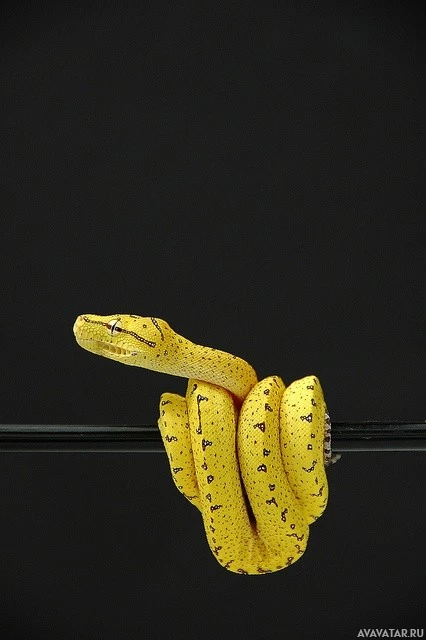 На снимке изображена желтая змея, которая кажется древесным видом из-за ее тонкого тела и длинного хвоста. Он расположен на черном фоне, который контрастирует с ярким цветом змеи, повышая ее видимость.