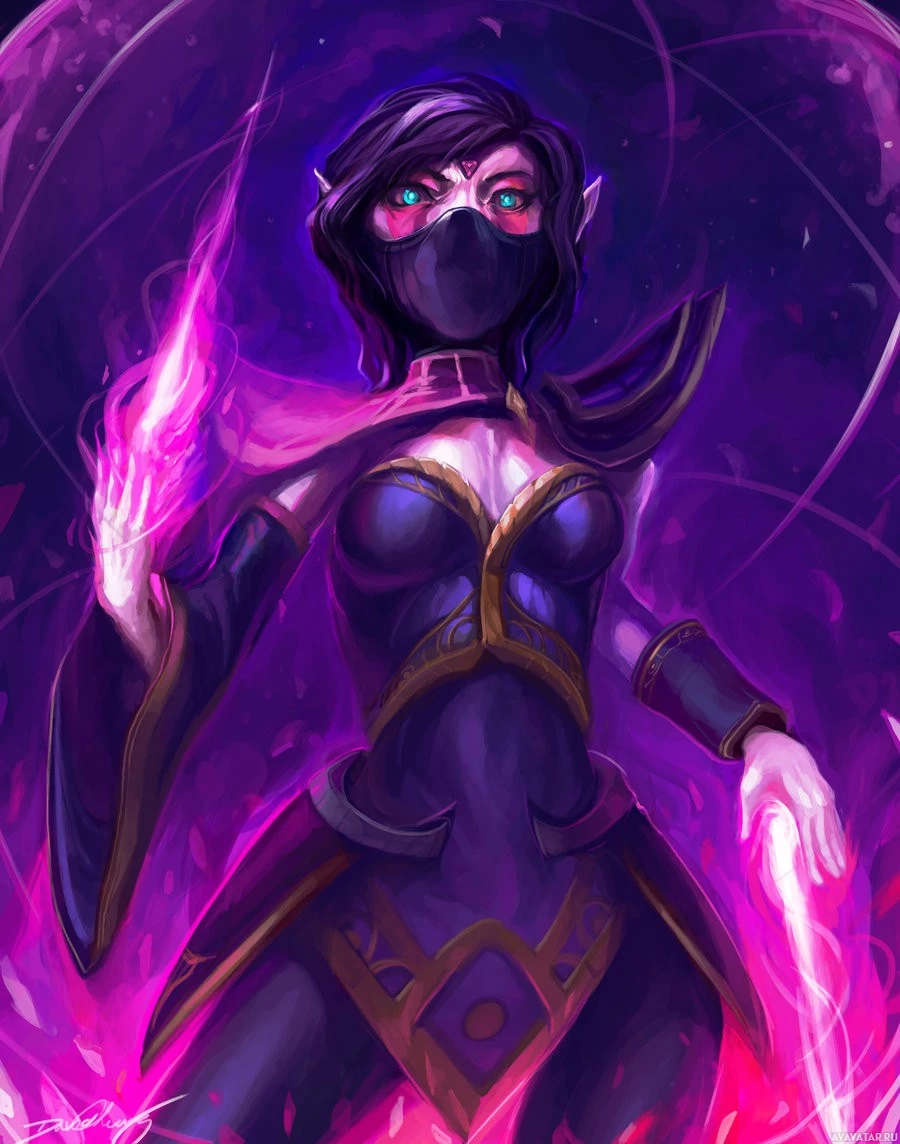 a hooded cloak, and what appears to be a mask or headgear that obscures her eyes. The character has long