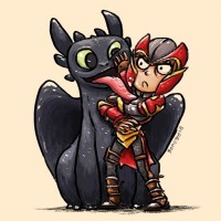 Dragon Knight, recognizable by her helmet and armor that include spikes on the shoulders and chest, which are characteristic of this hero's design in the game. The Dragon Knight appears to be interacting with the dragon, perhaps indicating a playful or friendly encounter between the two characters from the game.