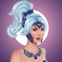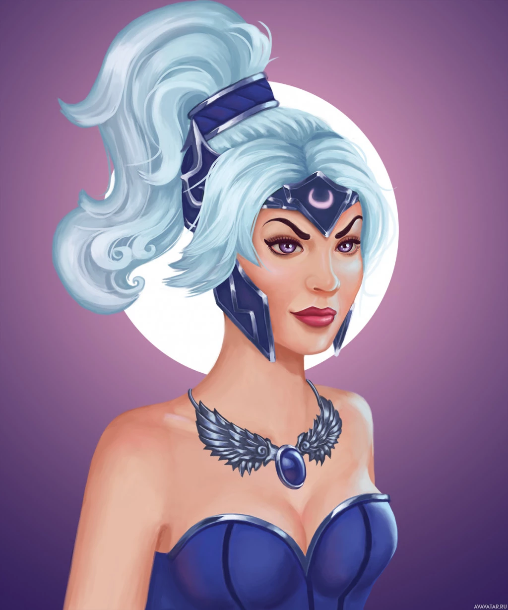 intricate designs on her chestplate and a necklace adorned with feathers and what seems like a crescent moon. Luna has
