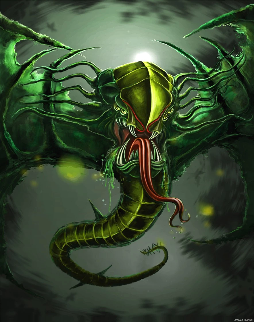 На картинке изображено существо, напоминающее героя Viper из видеоигры Dota 2. Это, по-видимому, фантазия или мифическое изображение змееподобного существа с несколькими головами и угрожающим выражением, возможно, задуманное как вражеский персонаж в игре.