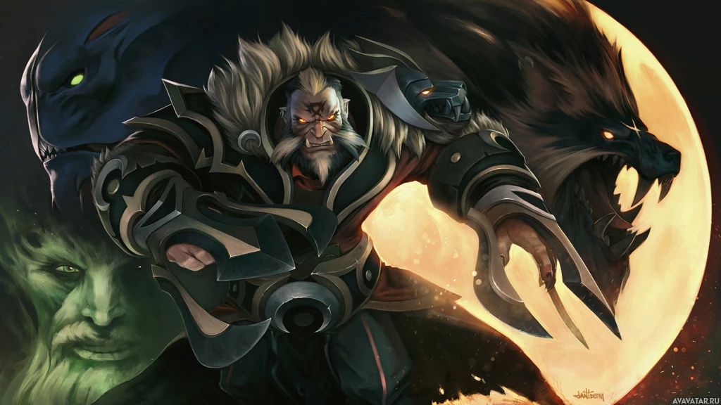 a group of heroes facing off against one another. This could represent a team fight within the game, where players control their respective heroes to try to defeat each other's heroes. The central part of the image shows what seems to be a werewolf character, likely representing a Lycanthrope from "Dota 2," which is known for its diverse roster of