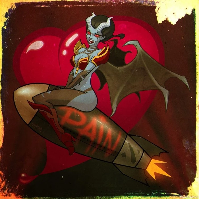 a character from the game Dota 2, known as Queen of Pain. She is depicted with devilish horns and wings, wearing armor with skulls on it, which reflects her