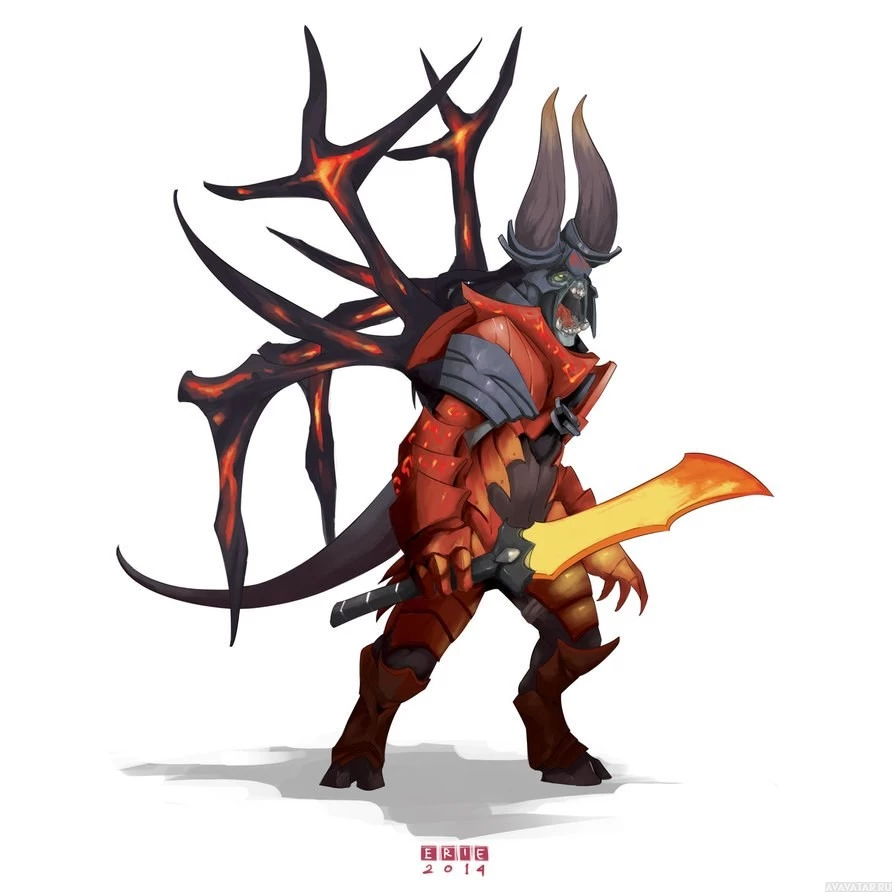 the video game "Dota 2." This is an illustration of a hero known as Doom (Dota 2). The character is depicted with horns, armor, and weapons that include