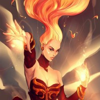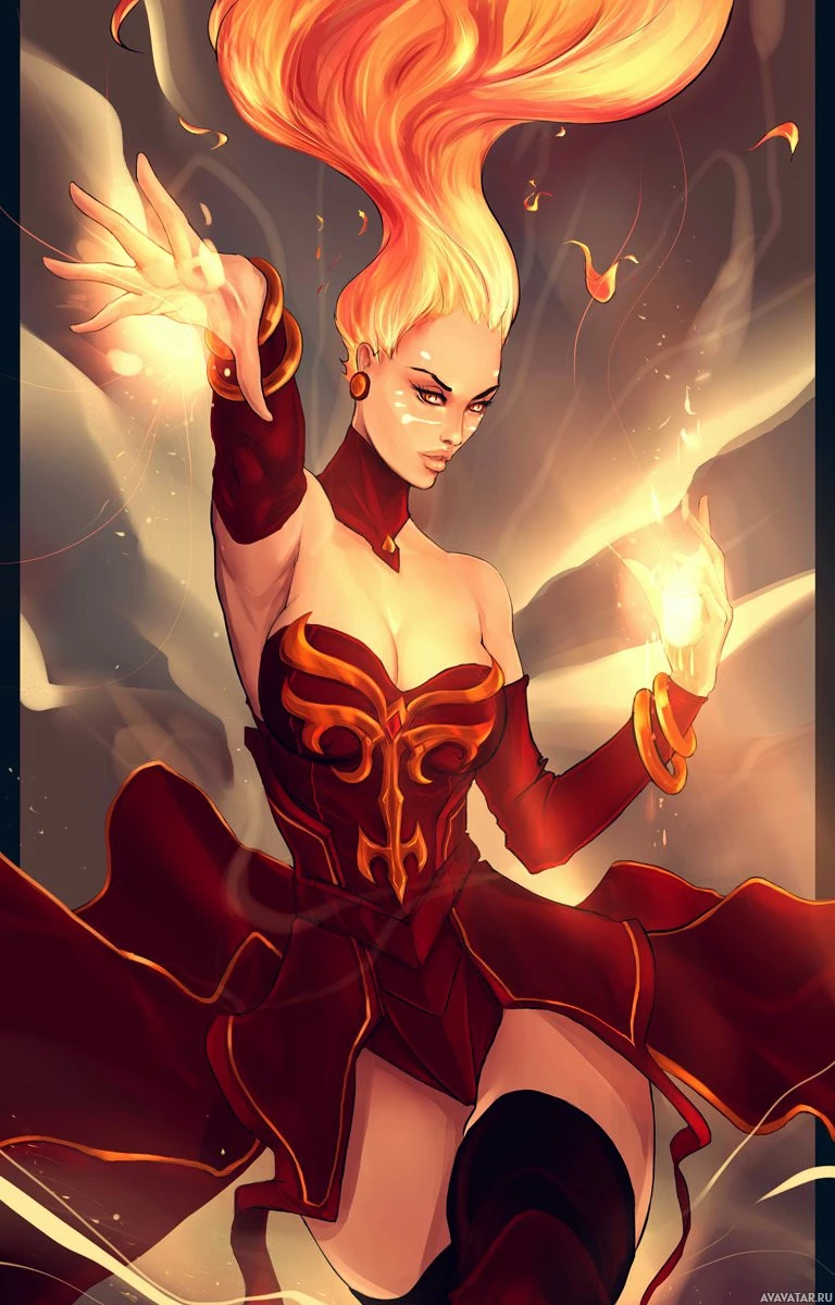 the glowing effects around her hands. This character is known as Lina from the game Dota 2, which is a popular multiplayer online battle arena (MOBA)