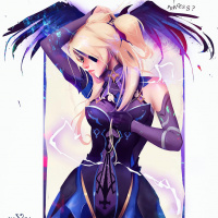 sorceress costume. The character has wings spread behind her head and is holding what looks like a staff or wand, which are often associated with magic or supernatural abilities in